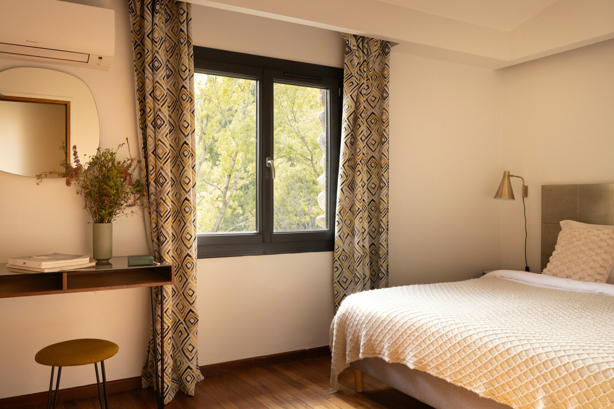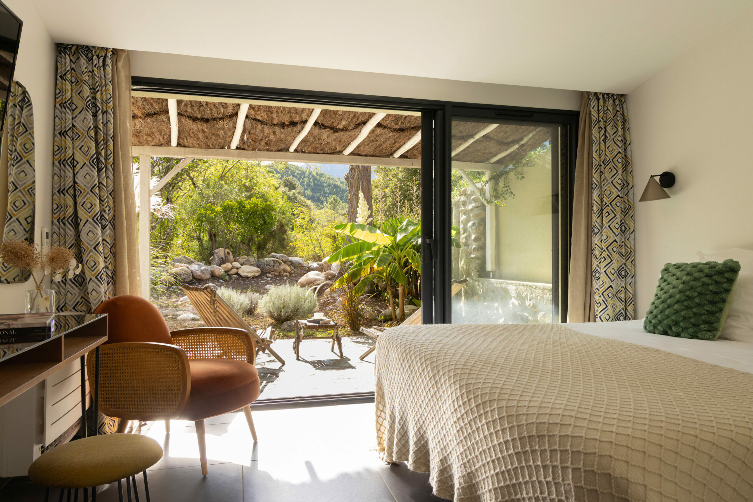 Les chambres ouvrent toutes sur de grandes baies vitrées lumineuses et des terrasses avec vue sur la nature ou la rivière.