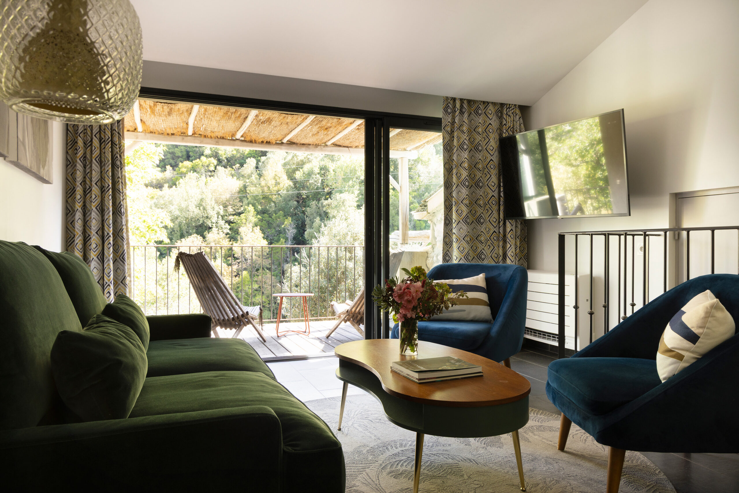 Les suites, composées d’un salon de 26 m² et d’une chambre de même surface, proposent un confort optimal dans une atmosphère chaleureuse et raffinée, les terrasses de ces suites offrent un panorama unique sur la nature et la rivière.